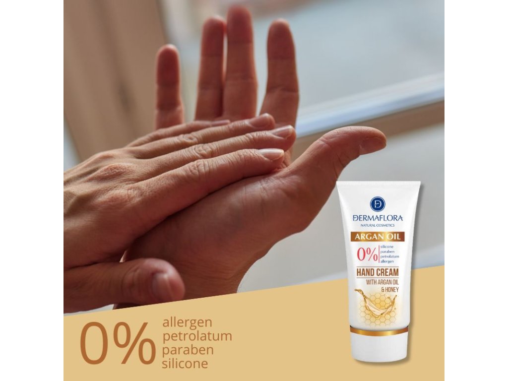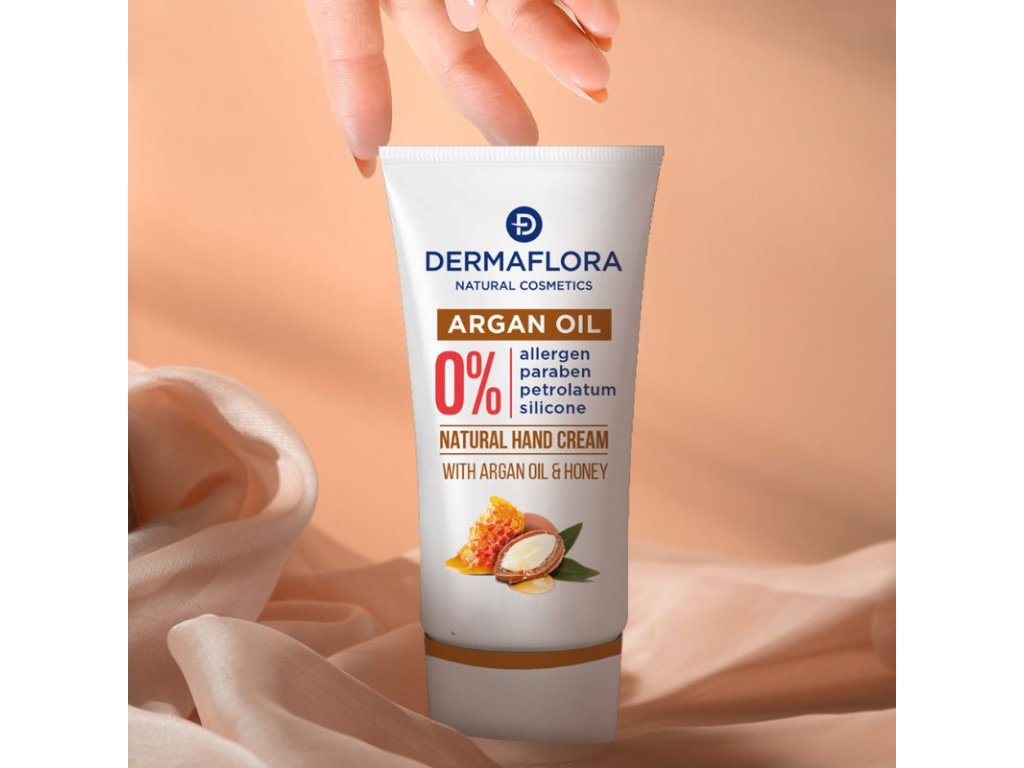 DERMAFLORA Crema de mâini cu Ulei de Argan și Miere - Crema delicată pentru mâini, cu ingrediente naturale, a fost dezvoltată pentru îngrijirea zilnică a pielii sensibile a mâinilor. Uleiul de argan, bogat în vitamina E, protejează, hrănește și hidratează pielea, îmbunătățește regenerarea acesteia și luptă împotriva îmbătrânirii premature a celulelor pielii. Extractele din miere, bogate în minerale și vitamine, înmoaie, calmează și hrănesc pielea. Utilizarea regulată previne uscarea pielii mâinilor și a unghiilor.