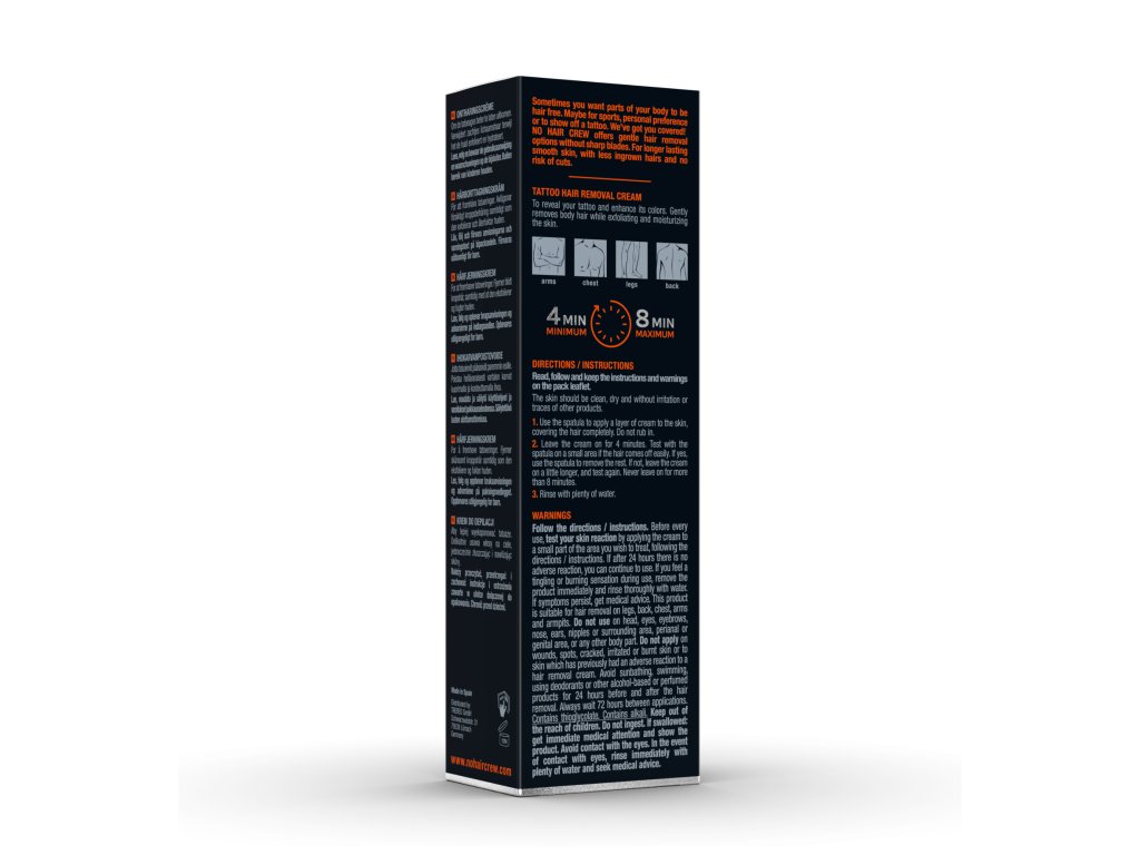 Prima cremă depilatoare pentru pielea tatuată îndepărtează fără durere și confortabil părul de pe corp, îngrijind în același timp pielea tatuată. Dezvăluie tatuajele ascunse sub păr.